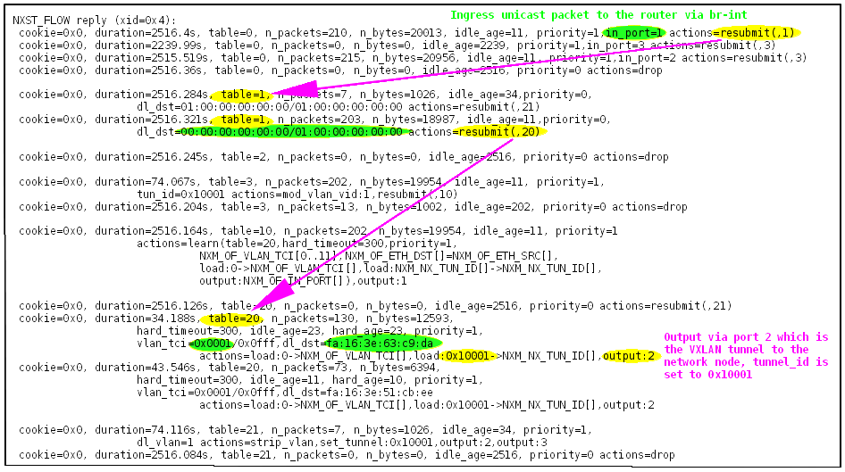 - In Openflow table 3 a rule has been added to map the globally unique tunnel_id to the vlan_id, which has only node local scope. Any traffic which matches this rule is forwarded to Openflow table 10. The action of the first rule of Openflow table 10 has two actions. The first one performs MAC learning and inserts the learned MAC addresses together with a vlan_id to tunnel_id mapping and the egress vlxlan port to Openflow table 20. Openflow table 20 is used for egress traffic. The second action is to output the traffic to Openflow port 1, which is the port to br-int.